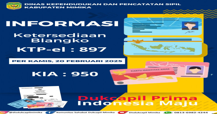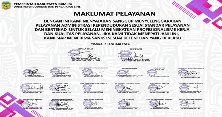 Selamat datang di Website Resmi Dinas Kependudukan dan Pencatatan Sipil (Disdukcapil) Kabupaten Mimika. Website ini kami hadirkan sebagai media informasi dan sarana komunikasi antara pemerintah dan masyarakat. Melalui platform ini, kami berkomitmen untuk memberikan pelayanan publik yang lebih cepat, mudah, dan transparan dalam urusan administrasi kependudukan.